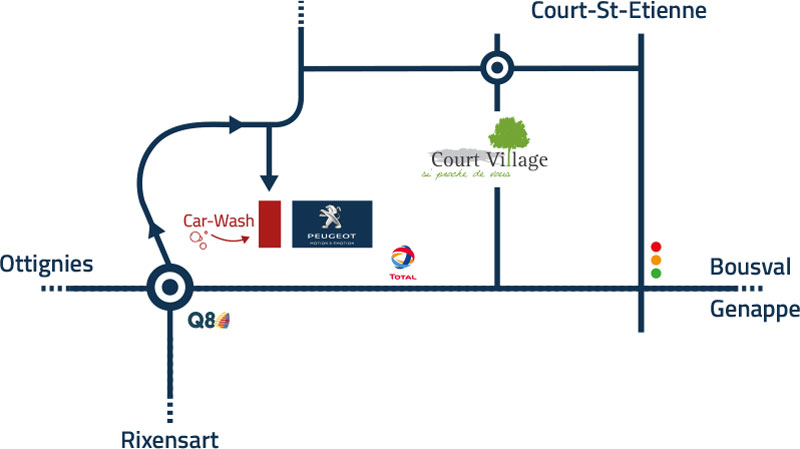 En venant d’Ottignies, au rond-point avant le garage, prendre la troisième sortie, suivre la route qui tourne et rentrer par l’arrière de l’entreprise.